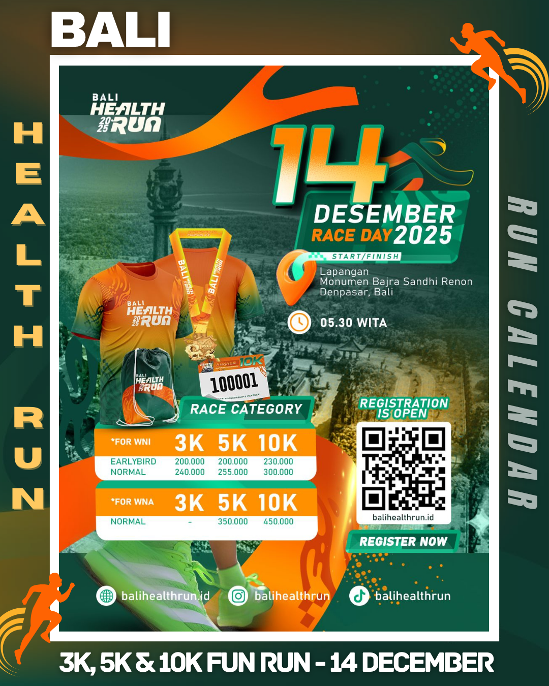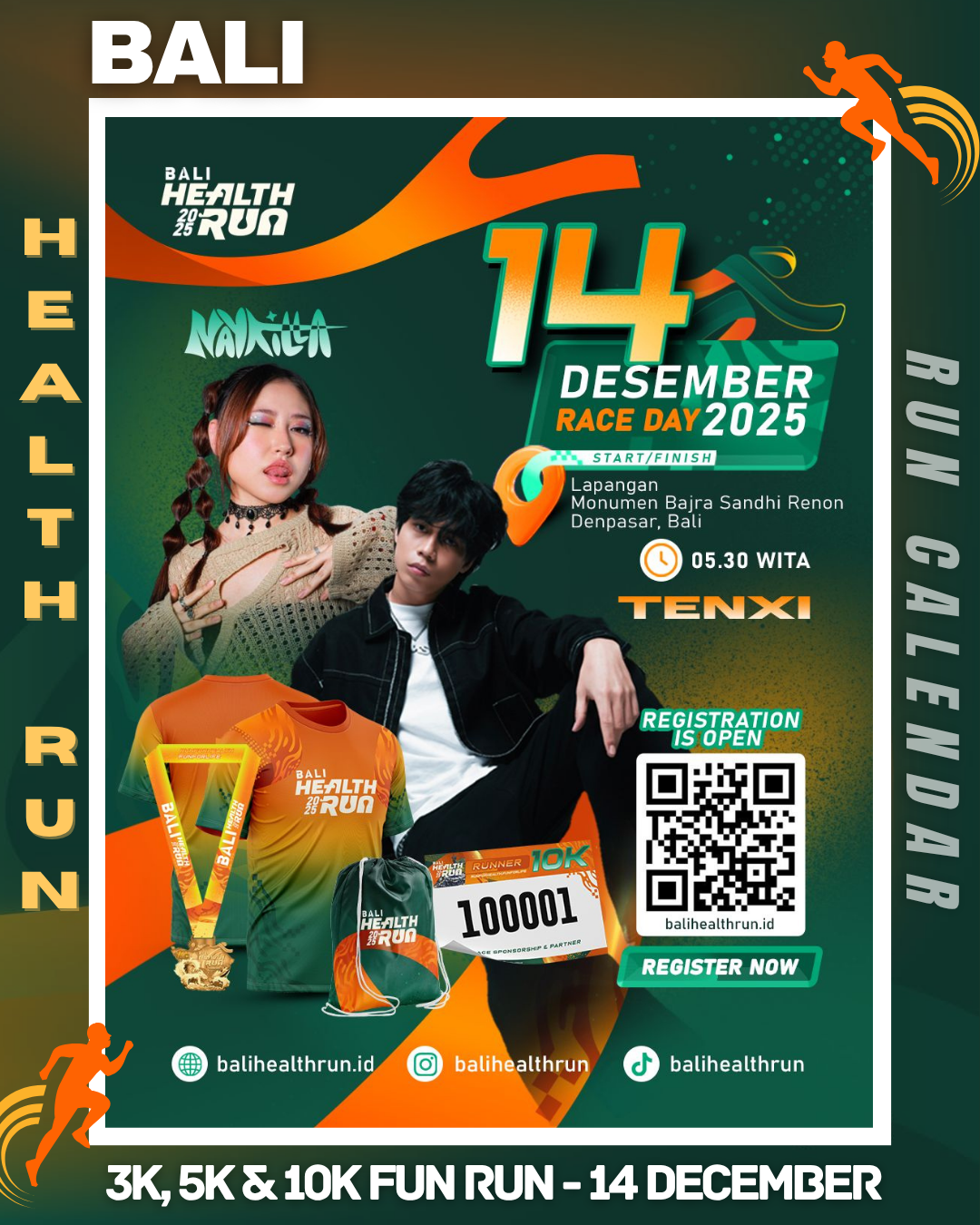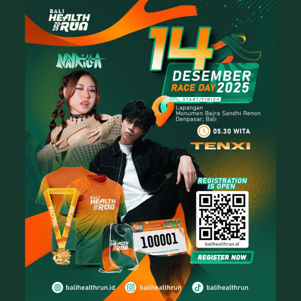 The event will take place on December 14, 2025, at Lapangan Renon, Denpasar – Bali, starting at 05:30 WITA. More than just a running event, Bali Health Run 2025 is a celebration of healthy living, happiness, and togetherness surrounded by the enchanting charm of Bali.