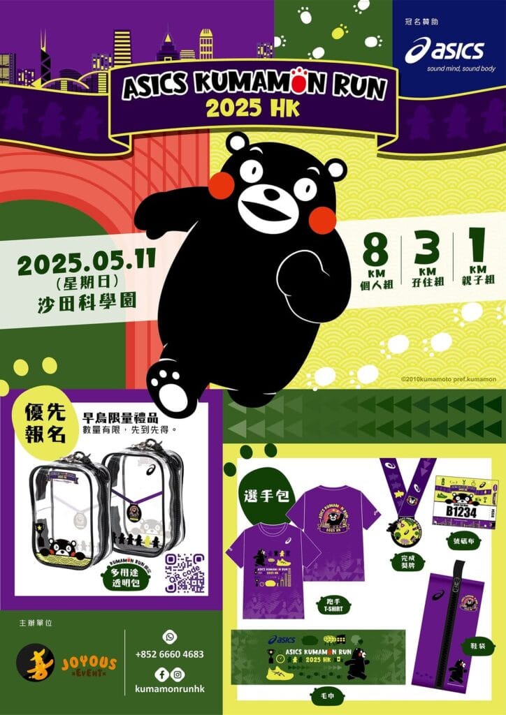 🐾 Hong Kong is about to get a whole lot cuter with the ASICS Kumamon Run 2025 landing this May! Beyond the usual race vibes, this event blends fitness and fun with a full-on Kumamon experience — think themed carnival, insta-worthy photo spots, and exclusive merch drops. Whether you’re dashing solo or teaming up with family or friends, it’s a celebration that brings the community together in the most playful way.