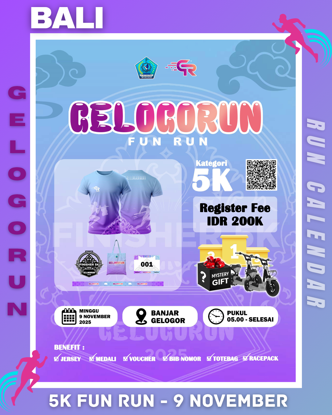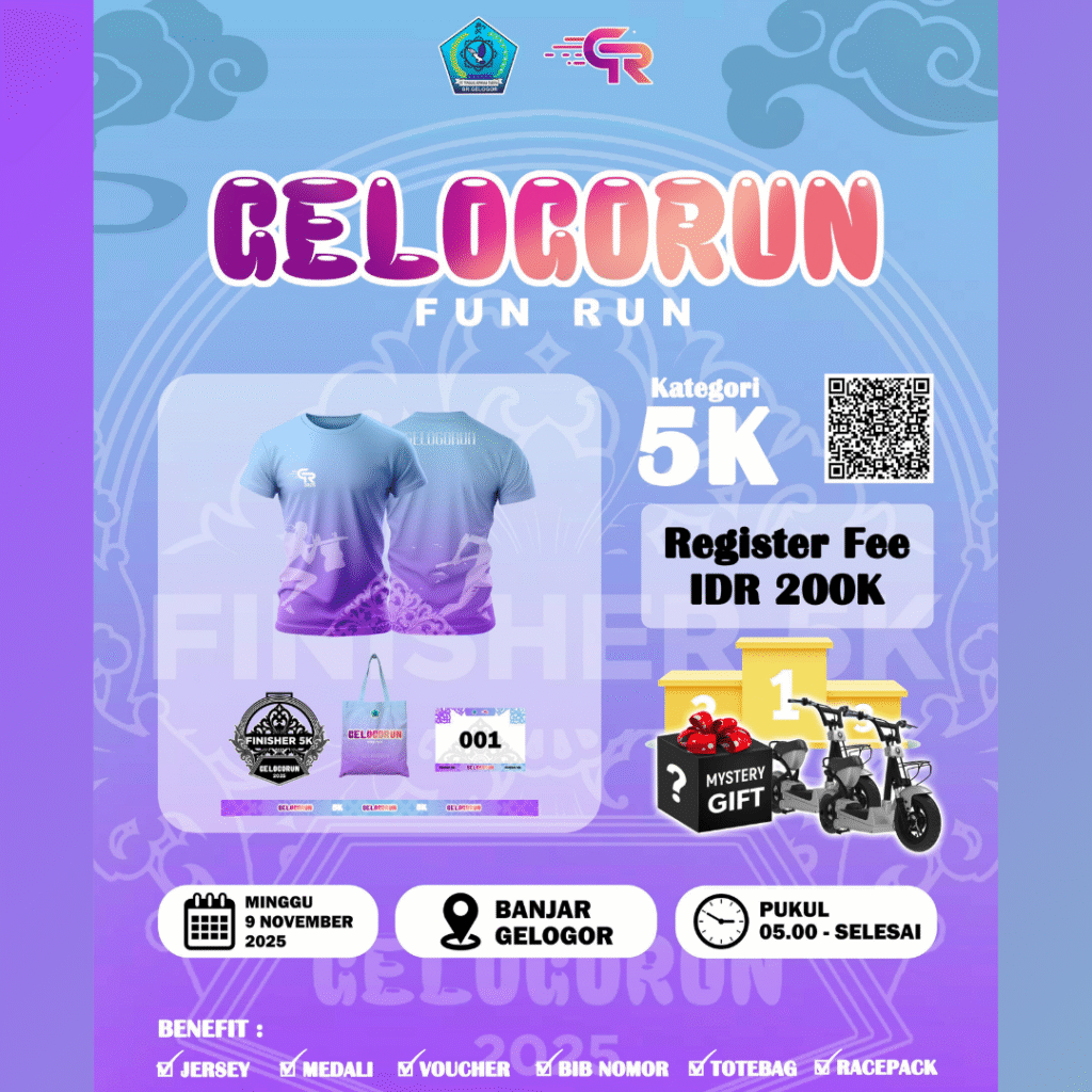 GelogoRun 2025 will take place on November 9, 2025, at Br. Gelogor, Jl. Bukit Tunggal No.13, Pemecutan, West Denpasar. Participants will receive exclusive benefits including a run shirt, medal, certificate, race pack, and bib number. In addition, podium prizes will be awarded to the top three male and female finishers.