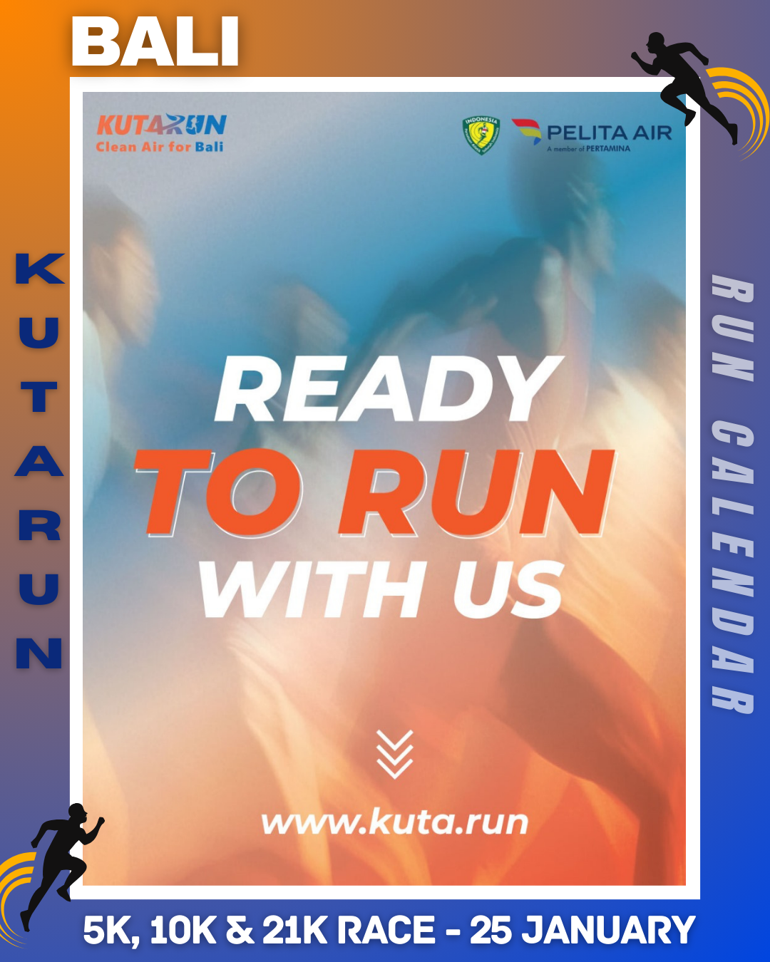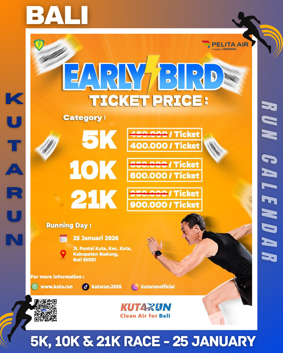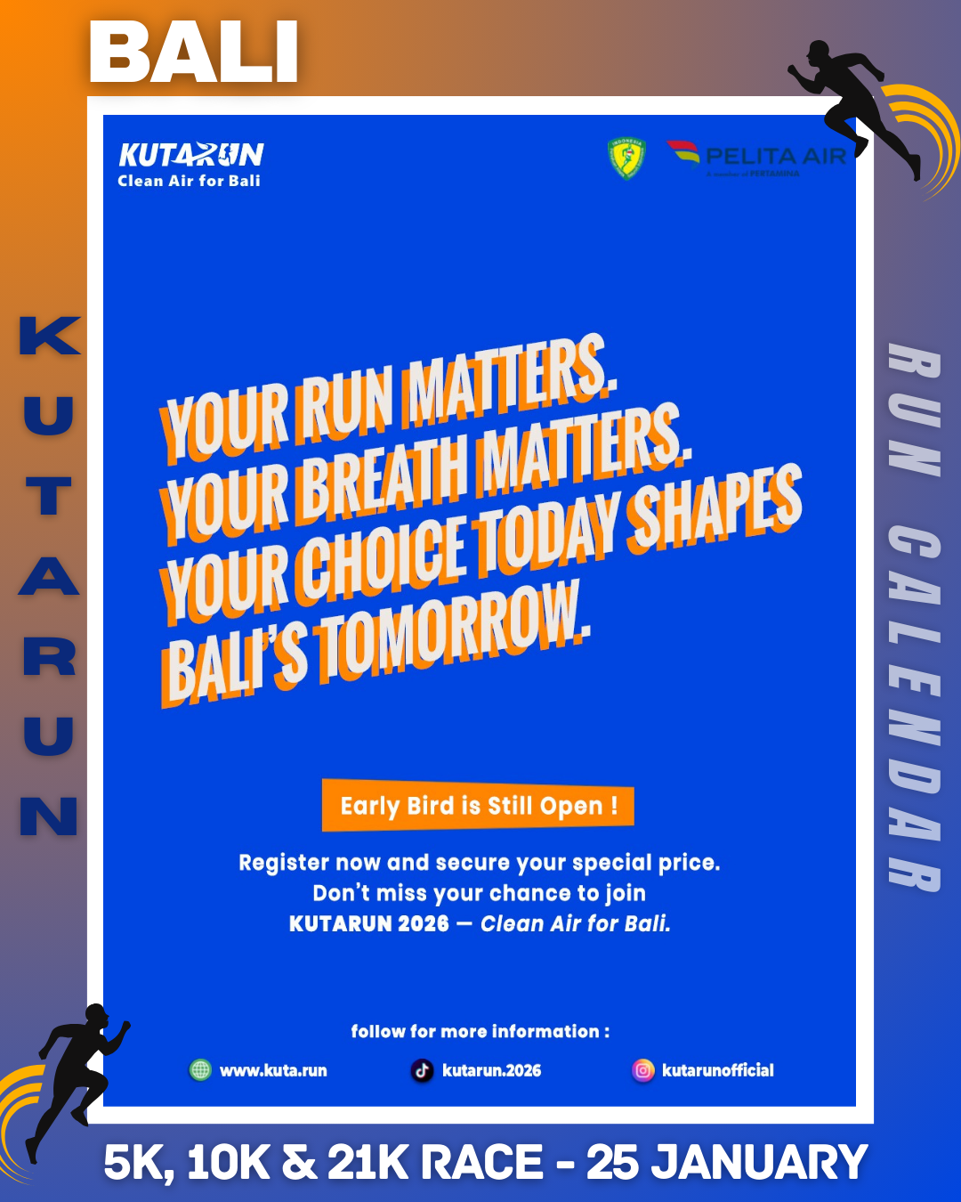 KUTARUN 2026 is an international running event supported by Pelita Air, a member of Pertamina. Carrying the spirit of We Run. We Care. We Celebrate a New Breath from Bali to the World, this event is designed as a professional-standard running competition for competitive runners from both Indonesia and abroad.