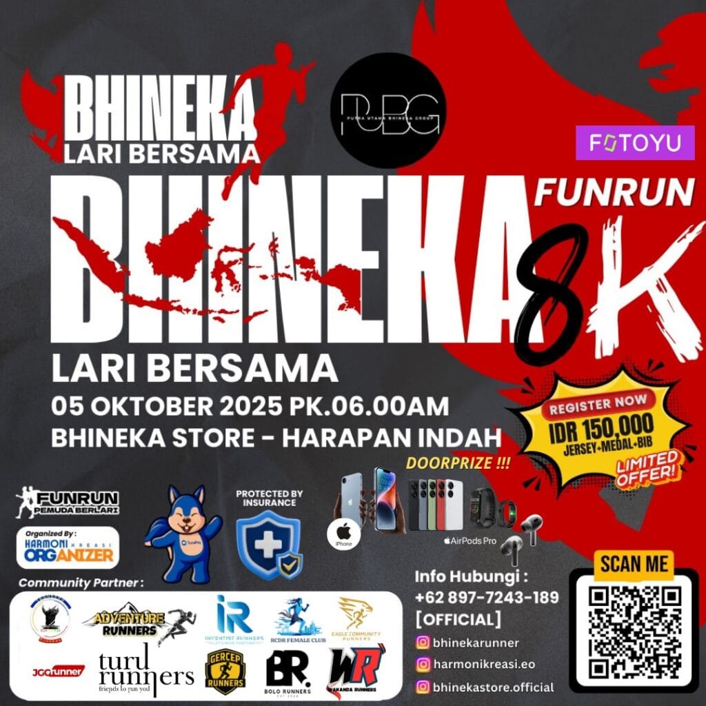 The event will take place on October 5, 2025, at Bhineka Store – Kota Harapan Indah. The meeting point for participants will be at the side area of I Love Shopping, where everyone will enjoy the 8K Fun Run challenge filled with energy, fun, and unforgettable moments.