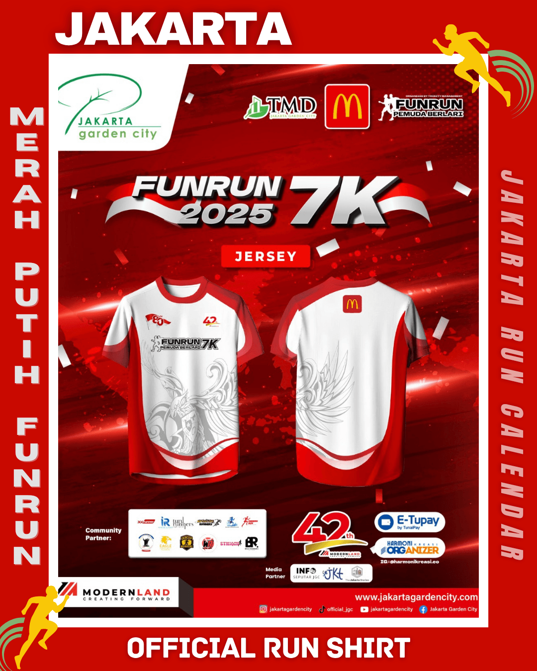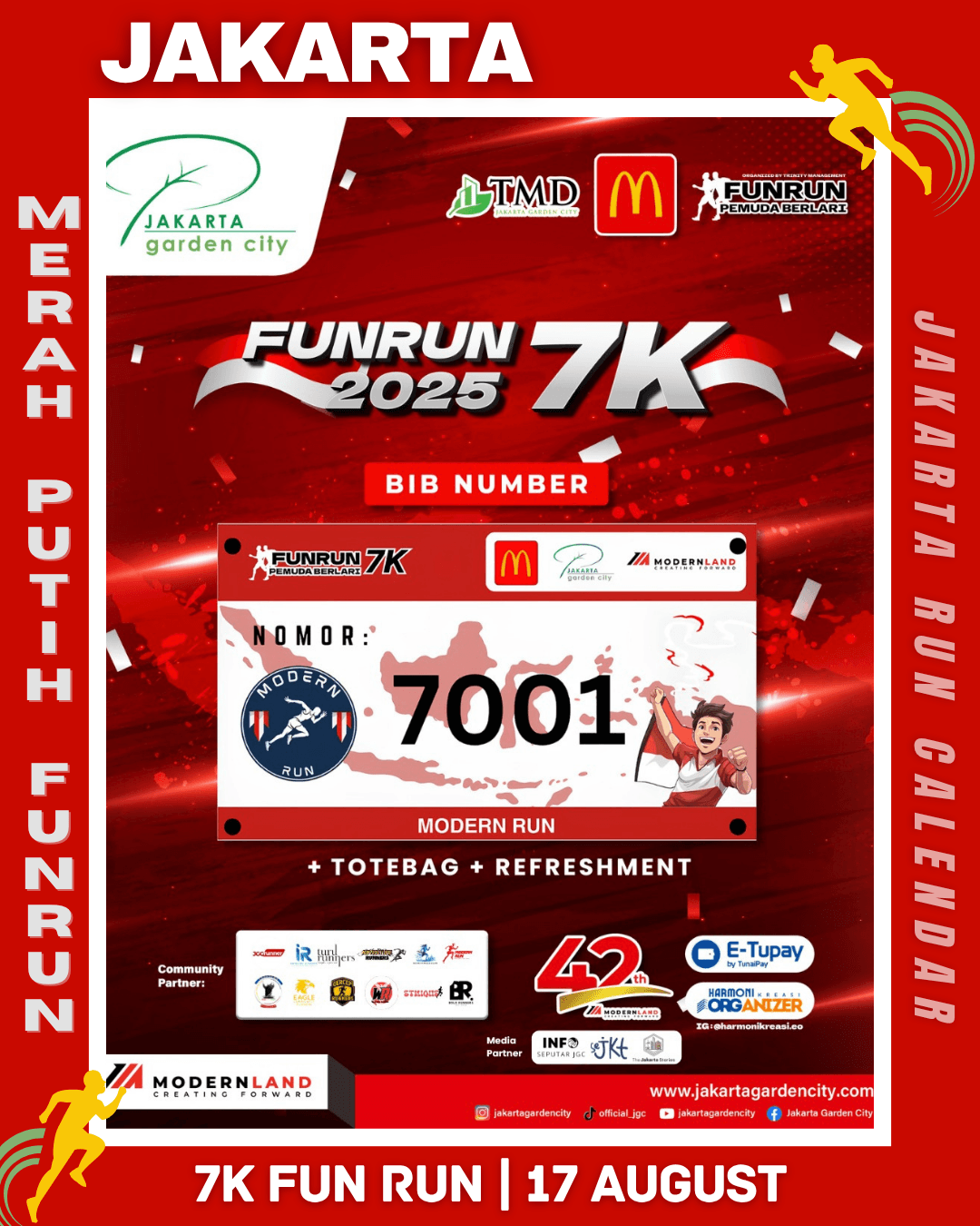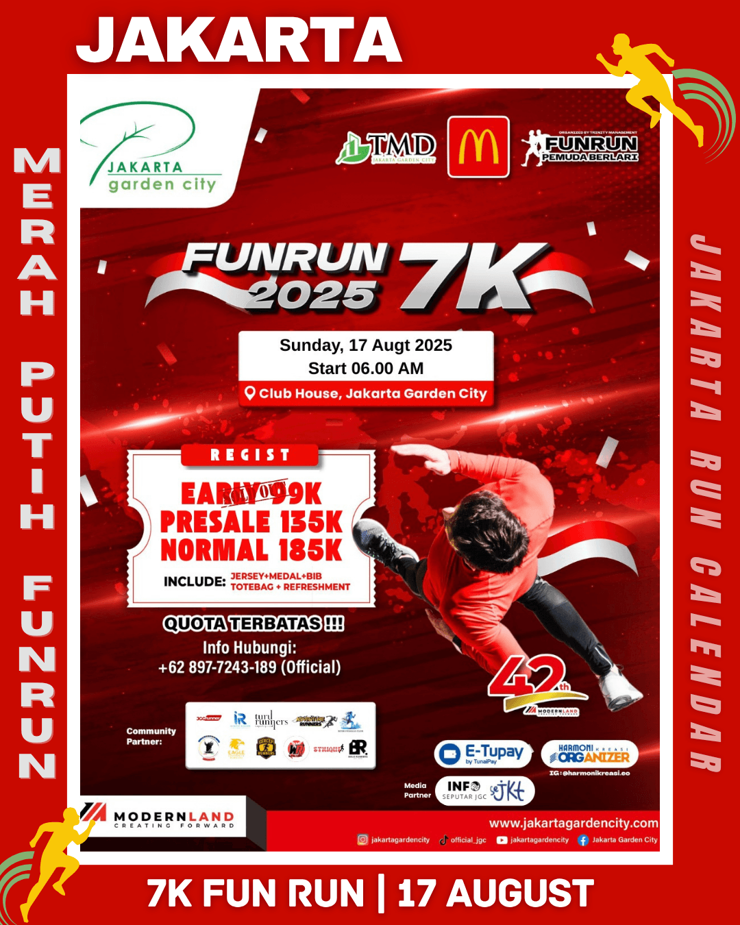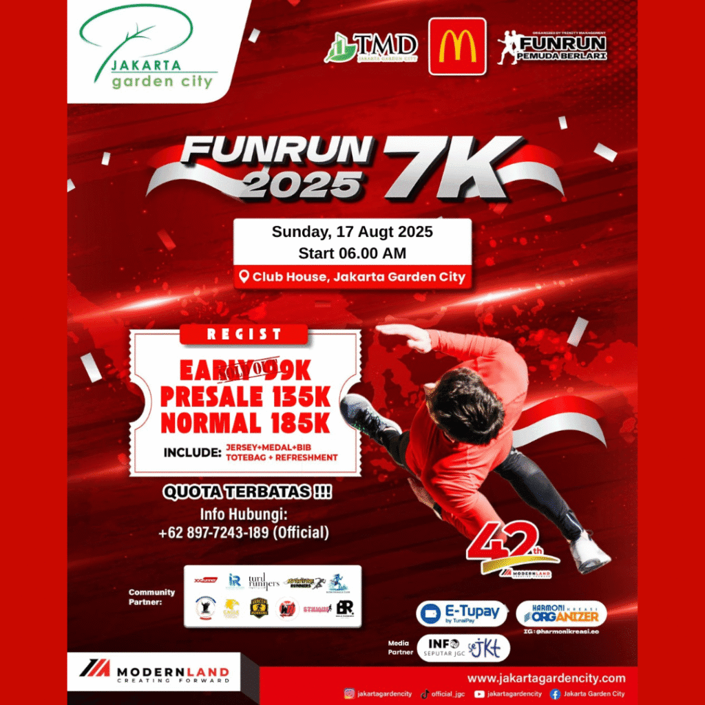 To commemorate the 80th Anniversary of the Independence Day of the Republic of Indonesia, Modern Run in collaboration with Harmoni Kreasi EO proudly presents Merah Putih FunRun 7K 2025, a running event filled with the spirit of unity and nationalism. The event will take place on August 17, 2025, starting at 06.00 AM at the Club House – Jakarta Garden City.