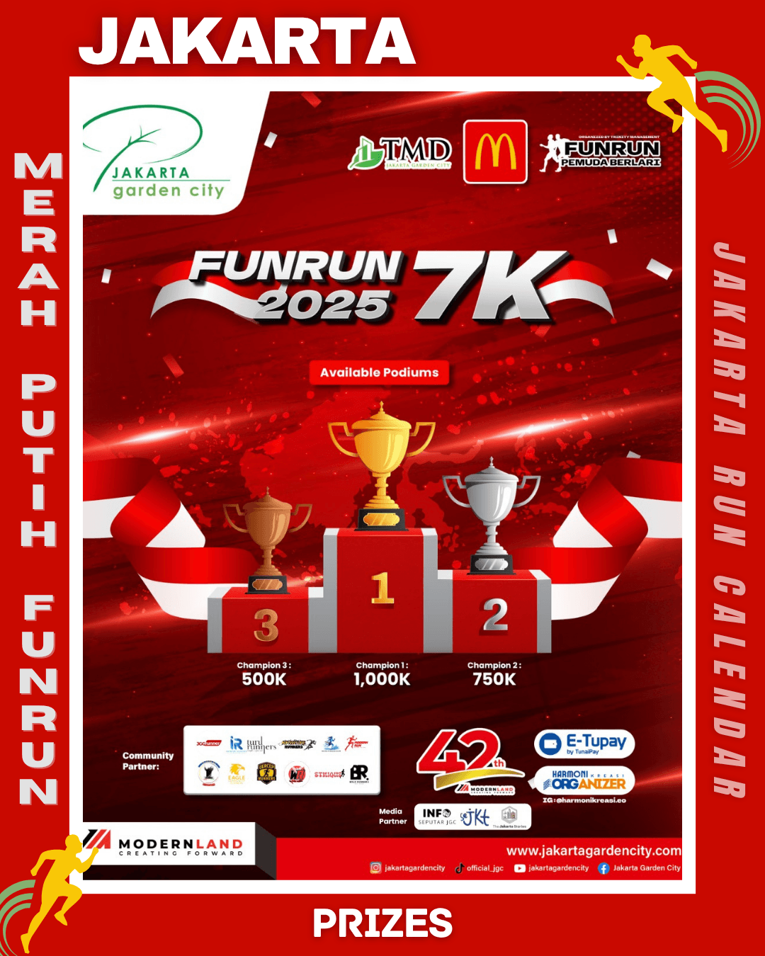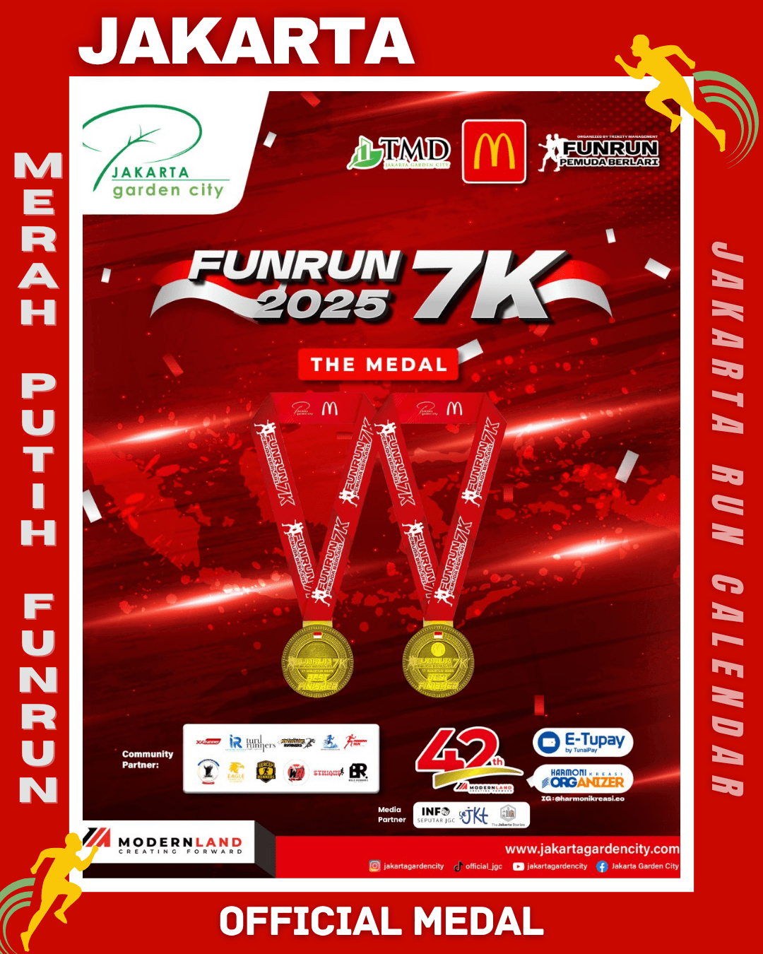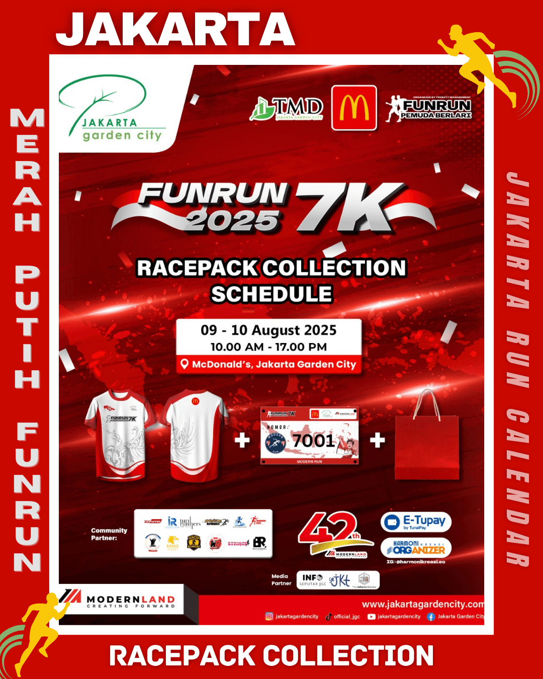 To commemorate the 80th Anniversary of the Independence Day of the Republic of Indonesia, Modern Run in collaboration with Harmoni Kreasi EO proudly presents Merah Putih FunRun 7K 2025, a running event filled with the spirit of unity and nationalism. The event will take place on August 17, 2025, starting at 06.00 AM at the Club House – Jakarta Garden City.