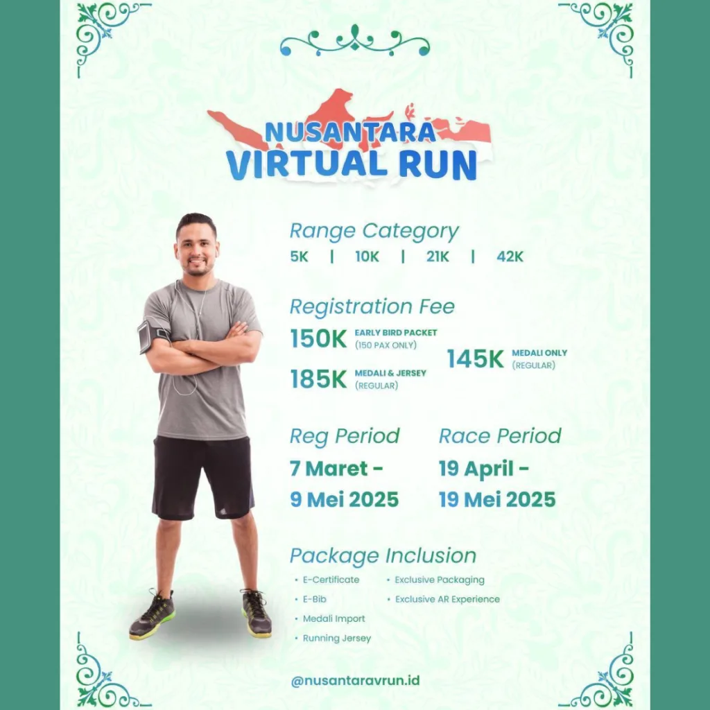 Don’t miss this chance to be part of a spirited celebration of movement and health. Register now and prove that your running spirit knows no limits — only at Nusantara Virtual Run 2025.