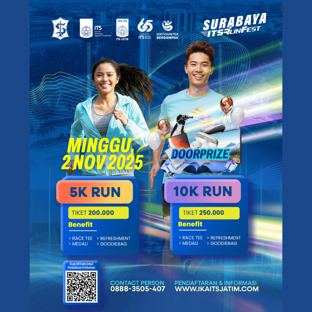The Surabaya ITS Run Fest 2025 is coming soon on November 2, 2025, at Balai Kota Surabaya. Organized by IKA ITS PW Jatim as part of the 65th Anniversary Celebration of ITS, this event marks a special moment to strengthen connections among alumni, the public, and running enthusiasts.