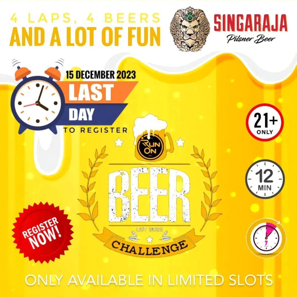 Run On Beer Challenge is a combination of running or light sports with the consumption of beer as one of the entertainment elements. Participants are invited to take part in a running distance of 4 x 400 meters that must be completed. Each runner must drink the provided beer and complete four designated laps of the run. For participants who vomit before completing this challenge, it will be considered a failure because they have to consume the beer before running.