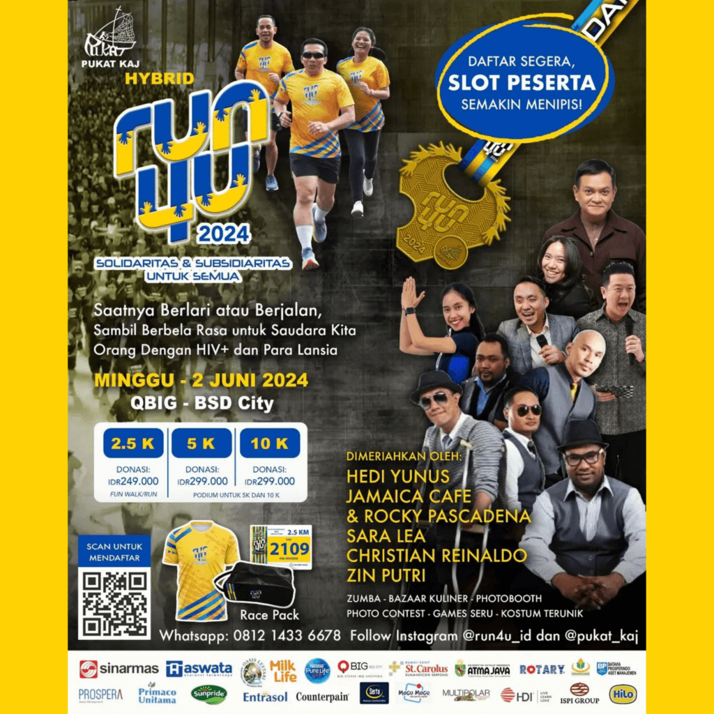 RUN4U is an ‘Annual Charity Run’ that this year carries the theme of ‘Solidarity and Subsidiarity for Others’. The event is open to the public and can be participated in by all sectors of society. This activity has been organized by PUKAT KAJ (Professionals and Entrepreneurs of the Catholic Archdiocese of Jakarta) since 2018 and has been attended by thousands of participants, both from the Greater Jakarta area and from outside Greater Jakarta to international participants (virtually).